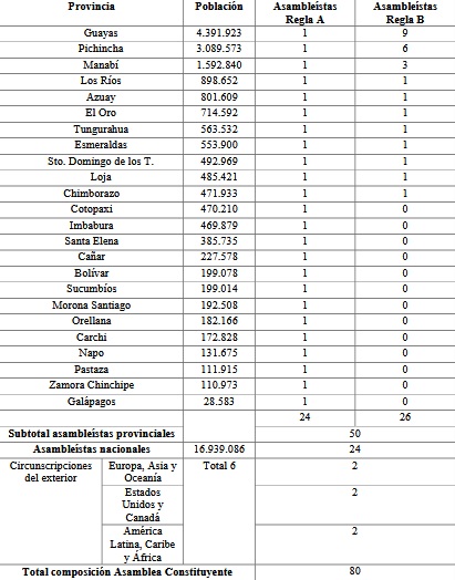 La futura asamblea constituyente, que se conformará si los ecuatorianos la aprueban en las urnas el próximo 16 de noviembre, contará con 80 asambleístas, 24 nacionales, 50 provinciales y seis del exterior. Dentro del dictamen favorable que emitió la Corte Constitucional, que le permitió al presidente Daniel Noboa convocar a una asamblea constituyente, el máximo órgano de justicia constitucional estableció el número de asambleístas, de acuerdo con la fórmula que remitió el primer mandatario. La distribución de los asambleístas provinciales será de la siguiente manera: un asambleísta constituyente por cada provincia (total 24). Una vez asignados estos, quedan 26 escaños por distribuir; se asignará un asambleísta adicional por cada 471.000 habitantes, de acuerdo con el último censo nacional de la población. En conformidad con estos cálculos, la provincia con más asambleístas constitucionales será Guayas, con 10; le sigue Pichincha con 7; luego viene Manabí, con 4. Aparte de las tres provincias más grandes del país, el resto tendrán 1 y 2 asambleístas constituyentes; Azuay, El Oro, Los Ríos, Tungurahua, Esmeraldas, Santo Domingo de los Tsáchilas y Loja tendrá solo dos representantes. Las 13 provincias restantes, contarán con solo 1 asambleísta, lo cual contrasta con lo que tendrán los ecuatorianos en el exterior, en cada circunscripción se elegirán 2 representantes, dando un total de 6. Distribución de asamblea constituyente
